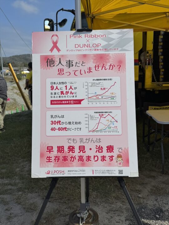 乳がんの早期発見・早期治療を推進する「ピンクリボン運動」を応援すべく、10月の「ピンクリボン月間」に、モータースポーツ活動において各サーキットのDUNLOPロゴマークを黄色からピンク色にすることで乳がん啓発活動をサポートする。