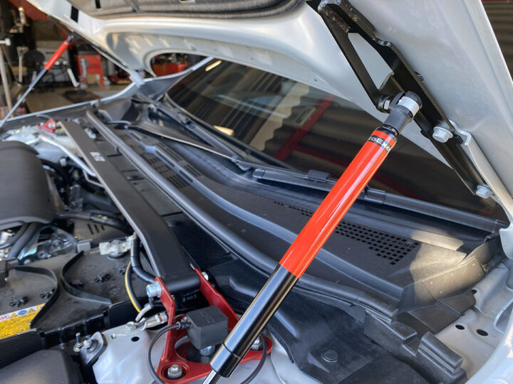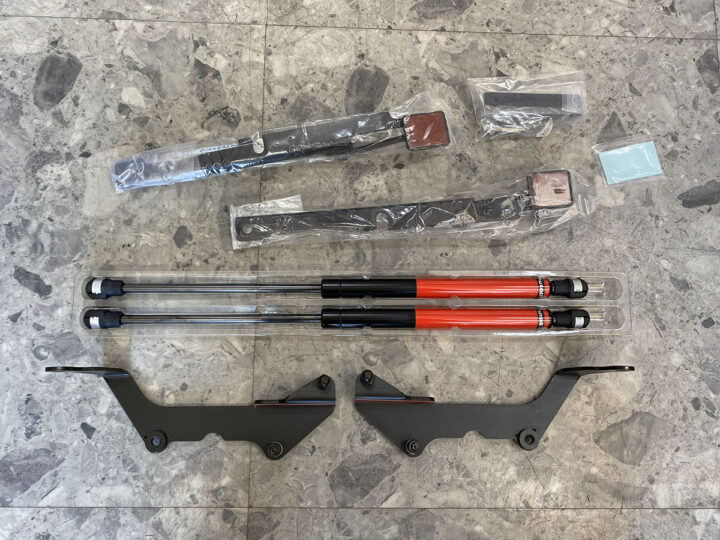 ガスダンパーの開閉を高圧ガス封入式ダンパーでスムーズにアシストし利便性と車格感を向上。エンジンルームの整備性向上させる。取り付け部のボンネットやフレームへの負荷を極力抑えた各車種専用マウントブラケットによりボルトオン装着が可能。ボンネットの重量に合わせてダンパーガス圧をチューニングしている。