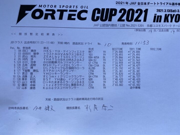 投稿日: 2021-03-13公開練習走行 ◇全日本ダートトライアル選手権 第1戦 公開練習走行 ◆京都コスモスパーク 本日、京都コスモスパークにて 「全日本ダートトライアル選手権 第1戦 公開練習走行」が行われました!! 昨日から降り続いてる雨は、本日も朝から降ったり止んだりの天候。 路面はWET、公開練習走行は1本。 久しぶりのダートコースを車両の状態を見ながら走り、順位は「5位」。 途中、ミスコースしそうになりタイムダウン。 しかし、Mirageの調子も良く明日の本番頑張ります!! ご声援よろしくお願いします。 2021年度よりクラス区分が変更になりました。 JD1続きを読む