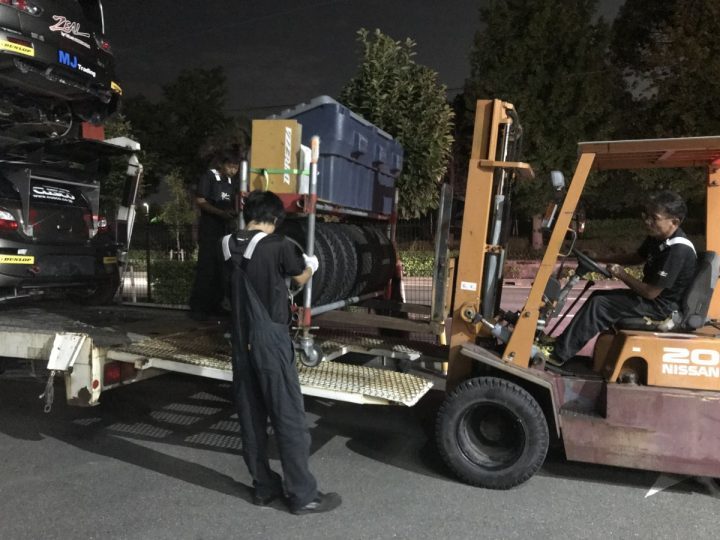 磯貝選手 CZ4AとMirageを積車に積み込んで、最後はタイヤラックを改造した工具箱をフォークリフトで積み込みます。