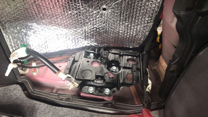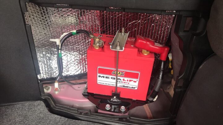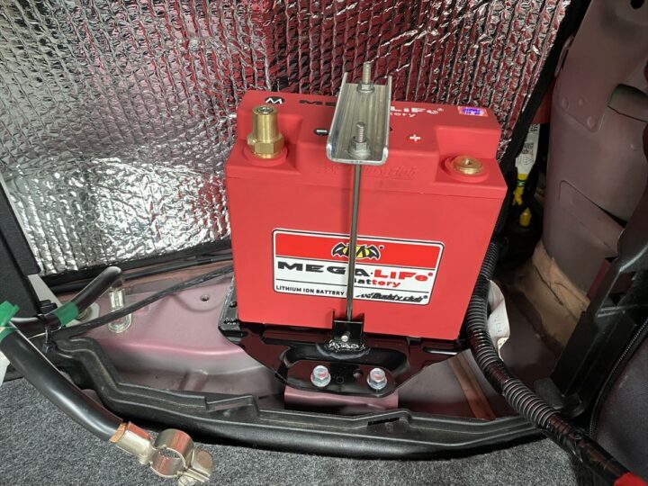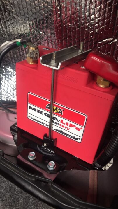 MEGA・Life Racing Batteryサイズに合わせ、純正台座も小さく加工し、固定しやすいように+ステーを溶接し製作。